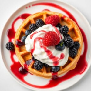 Vafl, nutella, plazma keks, kugla sladoleda od vanile, čokoladni preliv i mešano šumsko voće